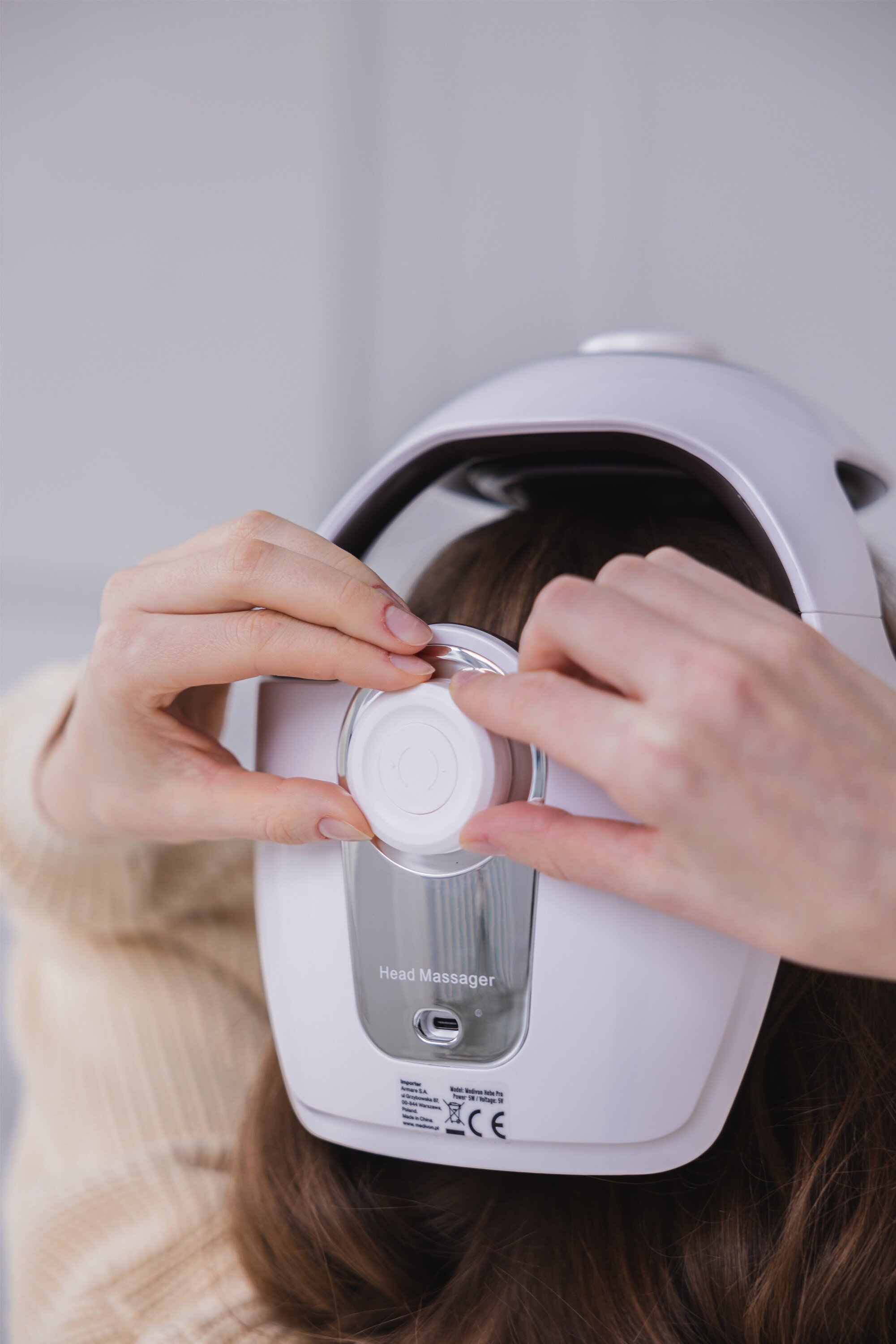 ⭐ Medivon Hebe Pro z inteligentnym systemem automatycznego dopasowania idealnie przylega do każdego kształtu i rozmiaru głowy, zapewniając wygodę i maksymalną efektywność masażu.