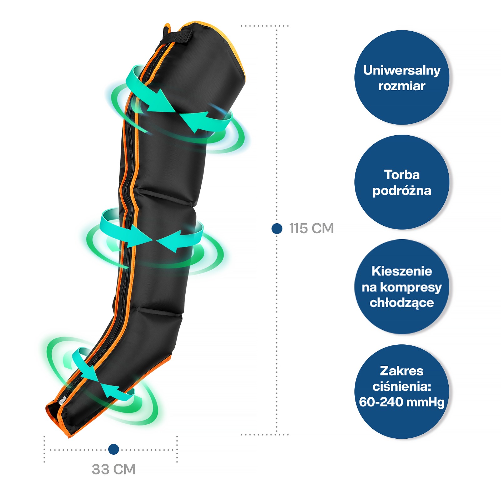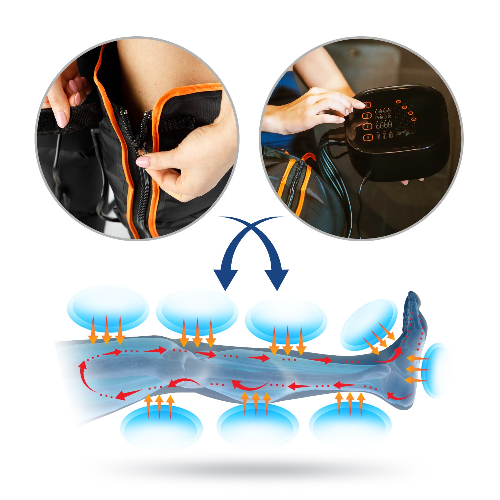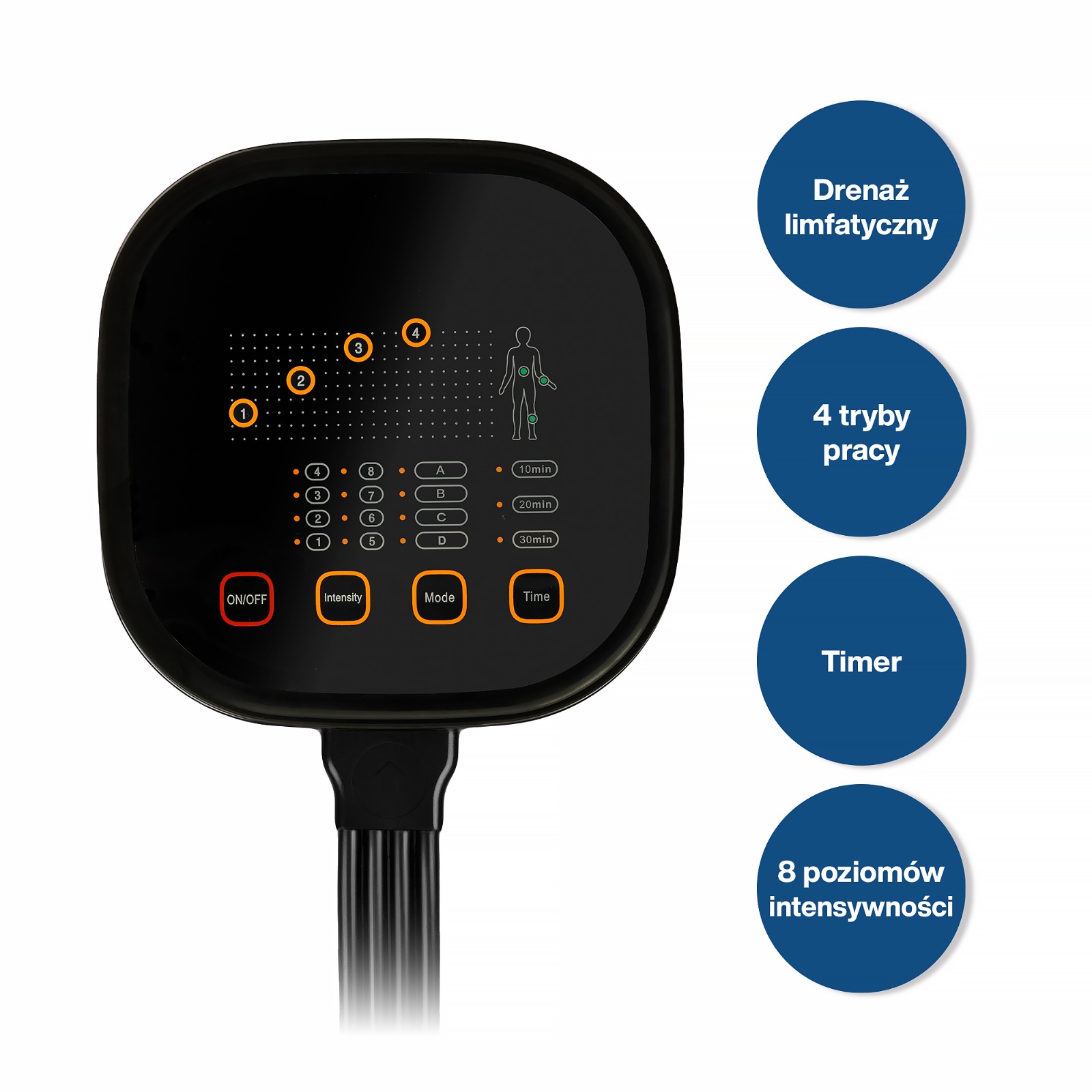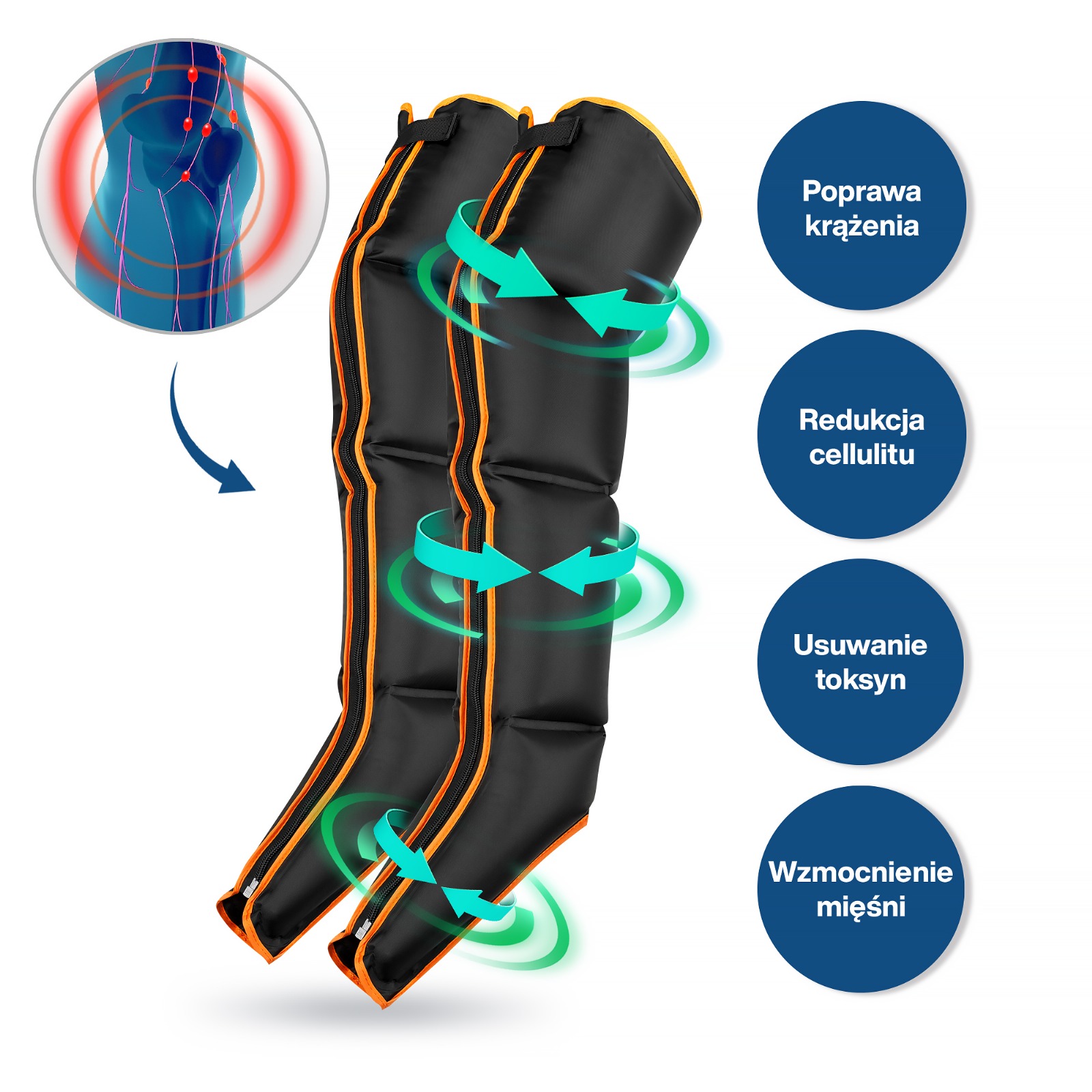 Urządzenie zapewnia masaż usprawniający przepływ chłonki (limfy) dla przeciążonych nóg w postaci naprzemiennego masażu uciskowego i ściągającego, aby w mgnieniu oka pobudzić do pracy układ limfatyczny i usprawnić krążenie krwi, oczyszczające ciało ze szkodliwych związków. Zaburzenie funkcjonowania układu może prowadzić do osłabienia odporności oraz zastojów w postaci obrzęków. Dzięki masażerowi można doświadczyć odprężenia i ulgi, jaką daje profesjonalny i całkowicie bezpieczny masaż, który można wykonać samodzielnie, bez opuszczania swojego domu.